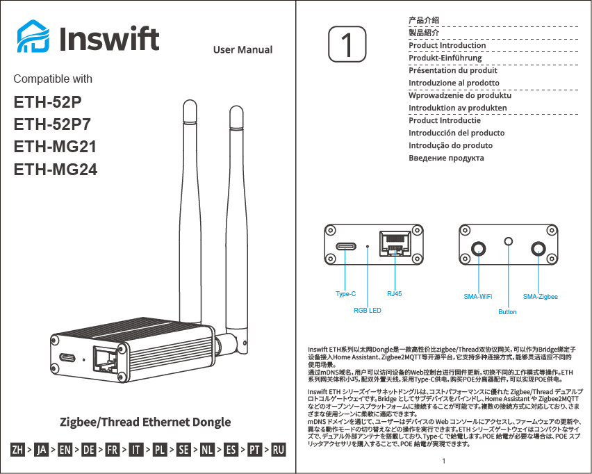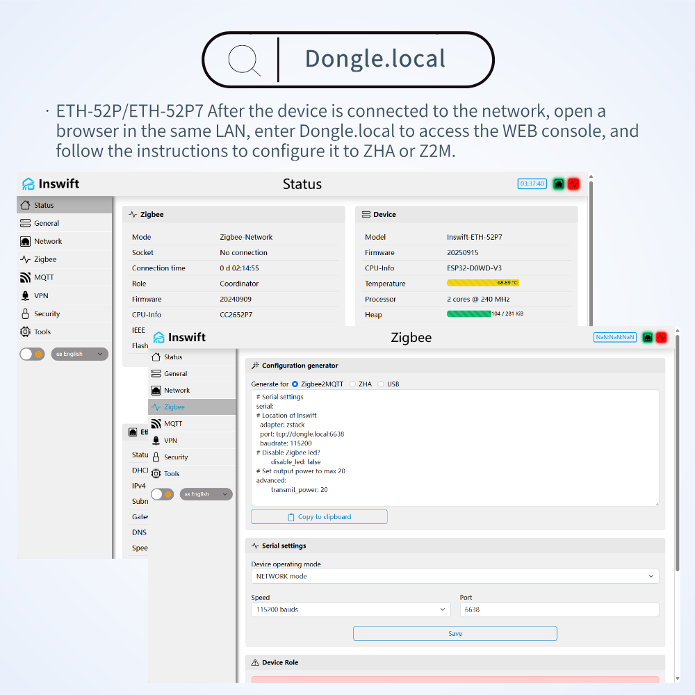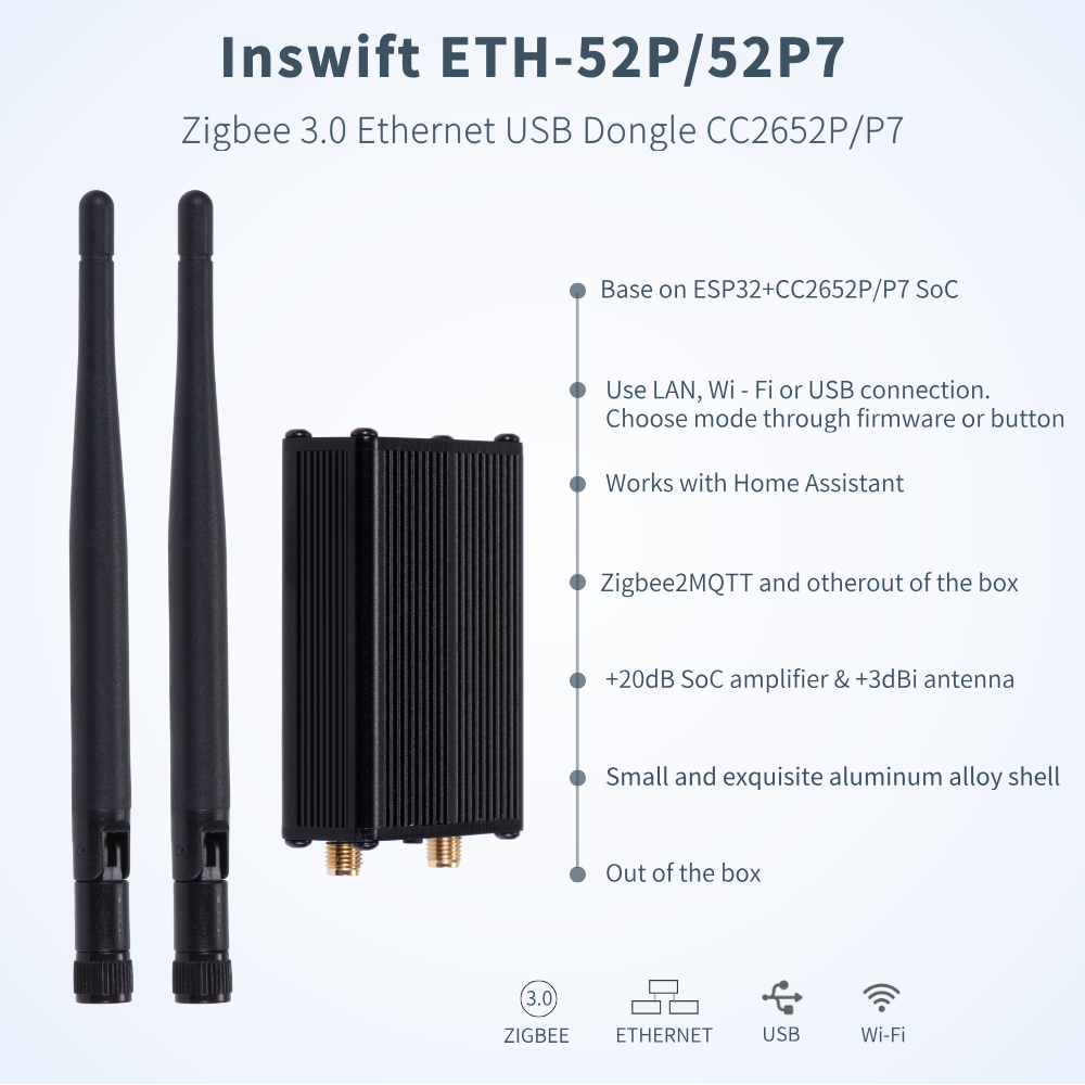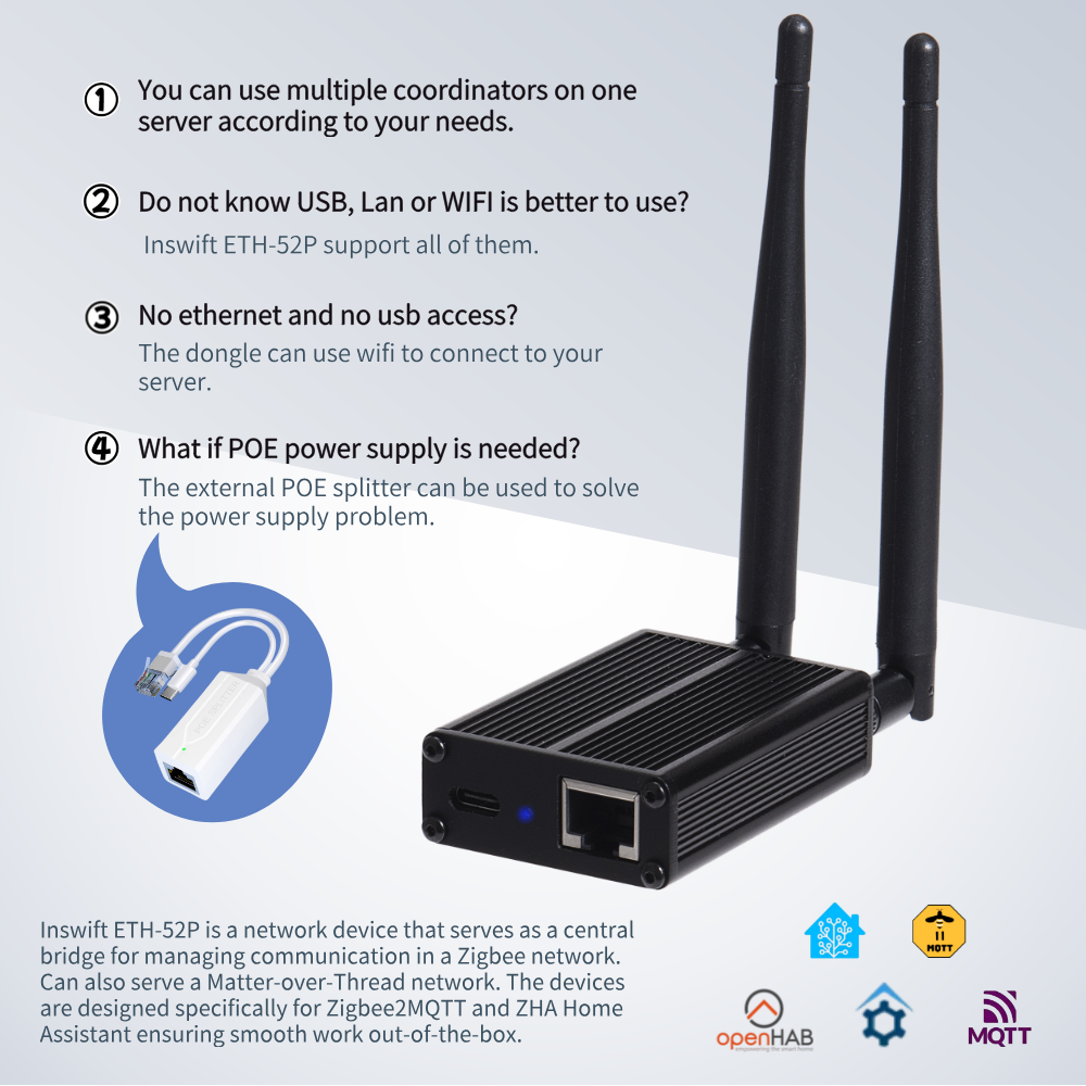 Inswift ETH-52P Zigbee 3.0 to Ethernet,USB,and WiFi gateway coordinator with PoE Zigbee2MQTT,Home Assistant ZHA Openthread